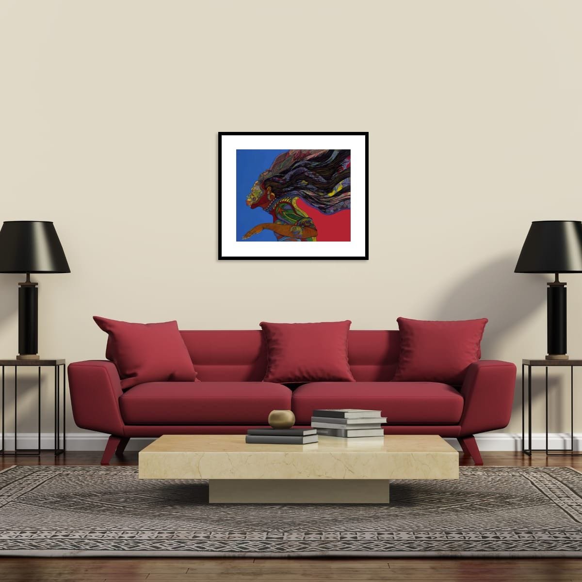 Let her movement speak across time. Adorning Glory (S/N 200) by Charles Bibbs captures the spiritual flight of a woman adorned in the language of her ancestors. Her body, clothed in vibrant symbolism, flows effortlessly through a deep red and blue realm—colors that evoke both power and transcendence. Bibbs, a master of Afrocentric expression, weaves sacred geometry, natural elements, and cultural motifs into every stroke, presenting a portrait that honors the elegance, strength, and sacred identity of Black womanhood. Her wind-swept hair becomes a living tapestry—an archive of memory and movement.