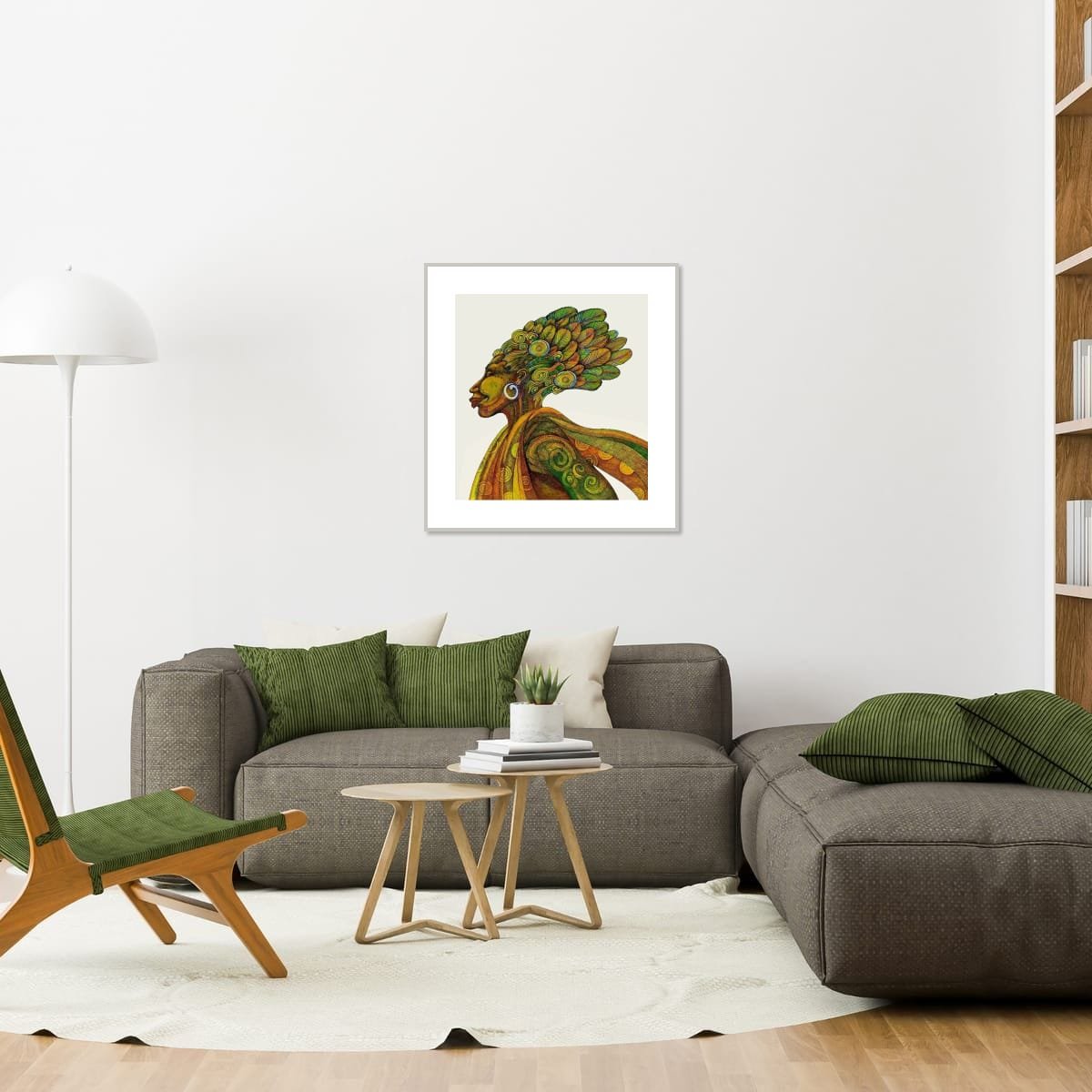 Celebrate the strength and wisdom of seasons past with Autumn Sun (S/N 250) by Charles Bibbs. This radiant portrait of a woman cloaked in golden hues captures the spirit of transformation and the harvest of ancestral knowledge. Her expression is both joyful and grounded, while swirling patterns and richly layered textures evoke autumn leaves, winds, and ritual. The feathered crown rising from her head symbolizes growth, dignity, and a deep connection to nature. Bibbs’ Afrocentric linework and color mastery bring vibrancy and soul to every curve and detail.