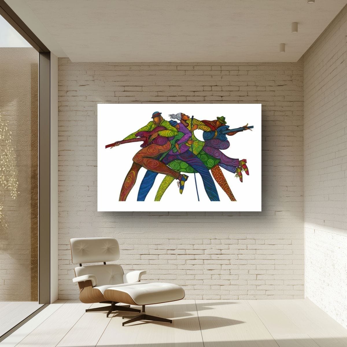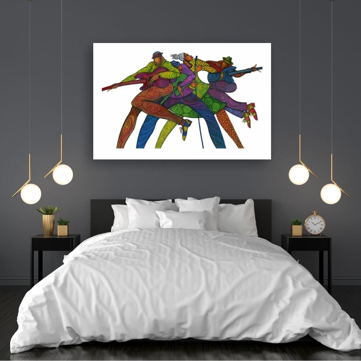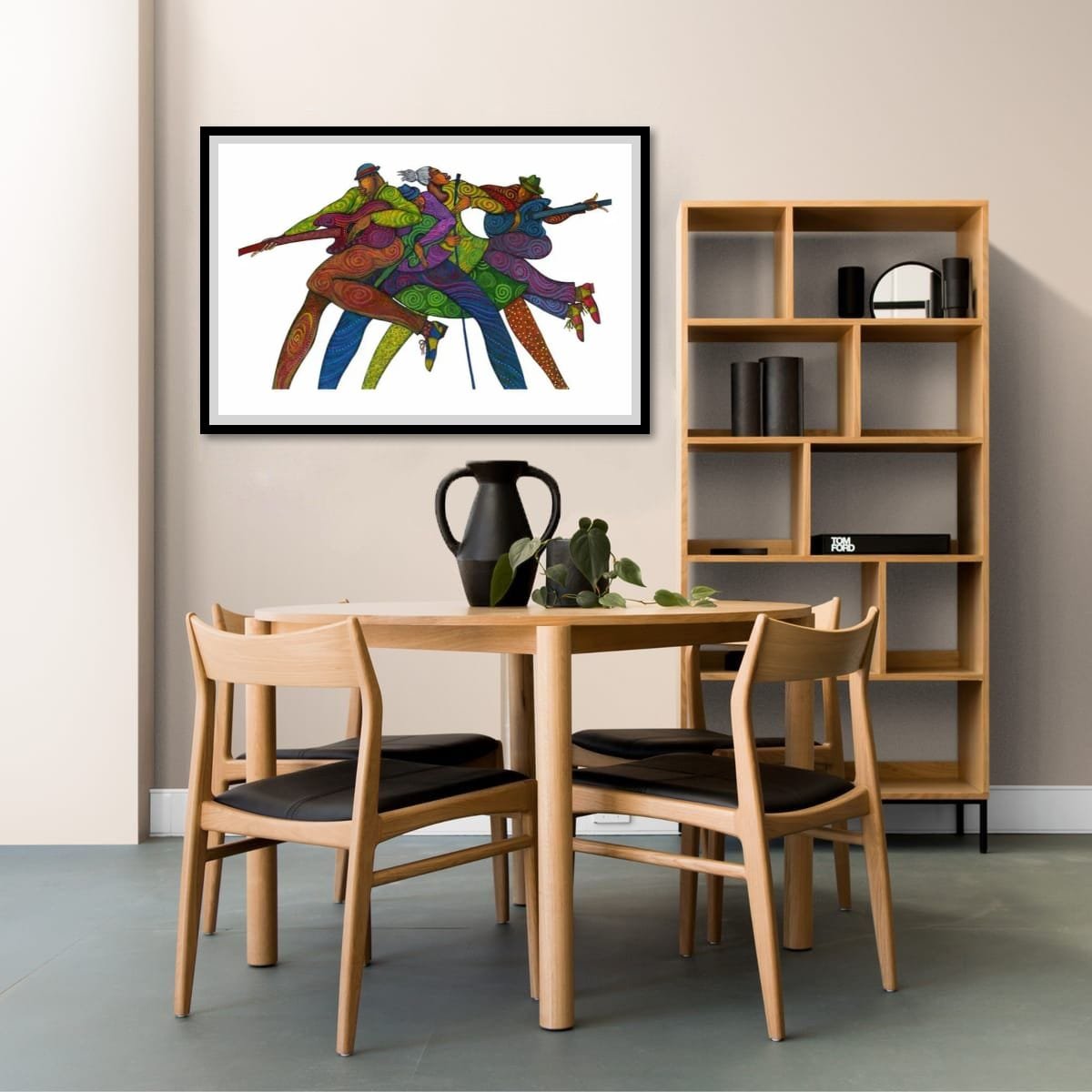 Let the pulse of Carnaval Blues (S/N 300) by Charles Bibbs sweep you into a joyous dance of heritage and harmony. This vivid lithograph captures four figures mid-motion—limbs intertwine, instruments sway, and vibrant spirals of purple, green, blue, and crimson swirl together in festive unity. Bibbs, celebrated for infusing his African American and Afrocentric influences with fluid movement and spiritual narrative, invites viewers into a moment of cultural celebration and connection. Through bold patterns and soulful rhythm, the piece becomes more than visual—it’s a vibrant echo of community and ancestral song. Whether in a living room or creative studio, make Carnaval Blues your statement of joy and cultural pride. Frame it and let its rhythm resonate in your space.