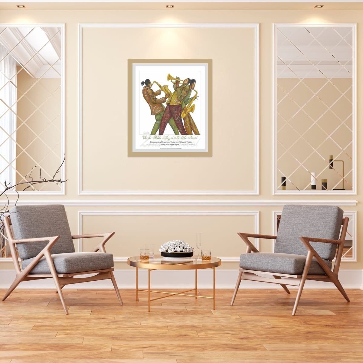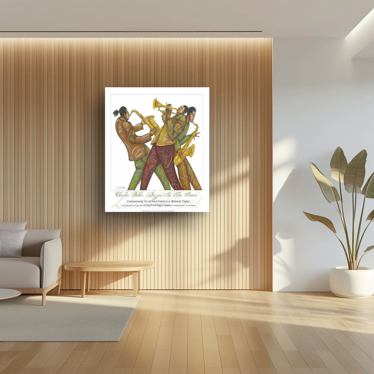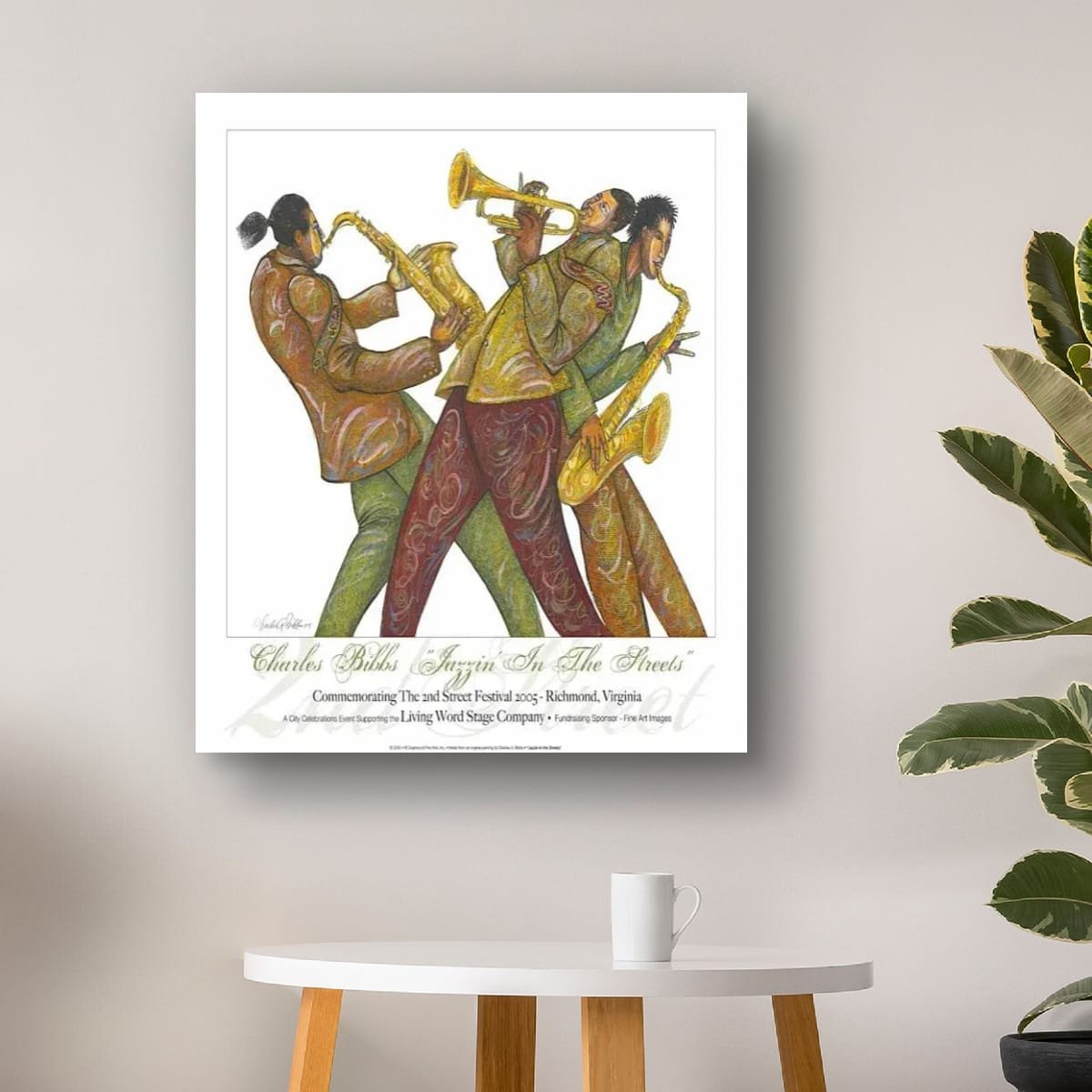Jazzin’ in the Streets by Charles Bibbs bursts with the raw vitality of music carried into public spaces. Three musicians, caught mid-performance, bend and sway with their instruments, their bodies echoing the rhythm of trumpet and saxophone. Bibbs’ signature patterns and warm earth tones create movement that feels alive, celebrating both individuality and unity within the ensemble. Originally commemorating the 2nd Street Festival in Richmond, Virginia, this piece reflects the cultural tradition of jazz as a community experience—spontaneous, expressive, and deeply rooted in heritage. With its bold energy and Afrocentric style, the artwork transcends performance to capture the spirit of togetherness and joy. Perfect for collectors, it transforms any wall into a stage alive with sound and history.